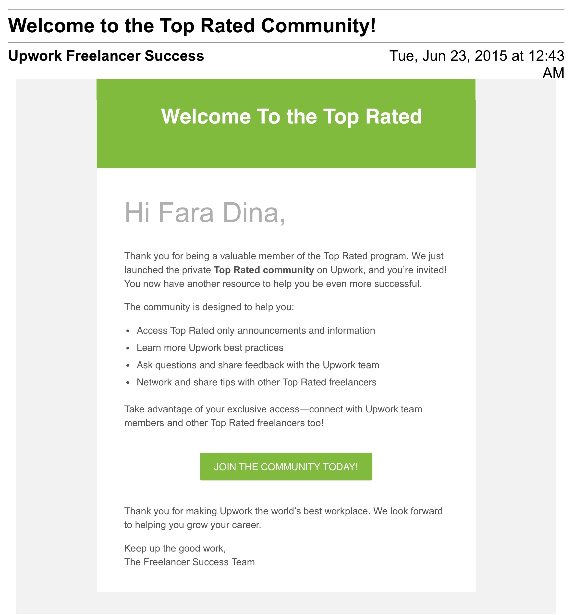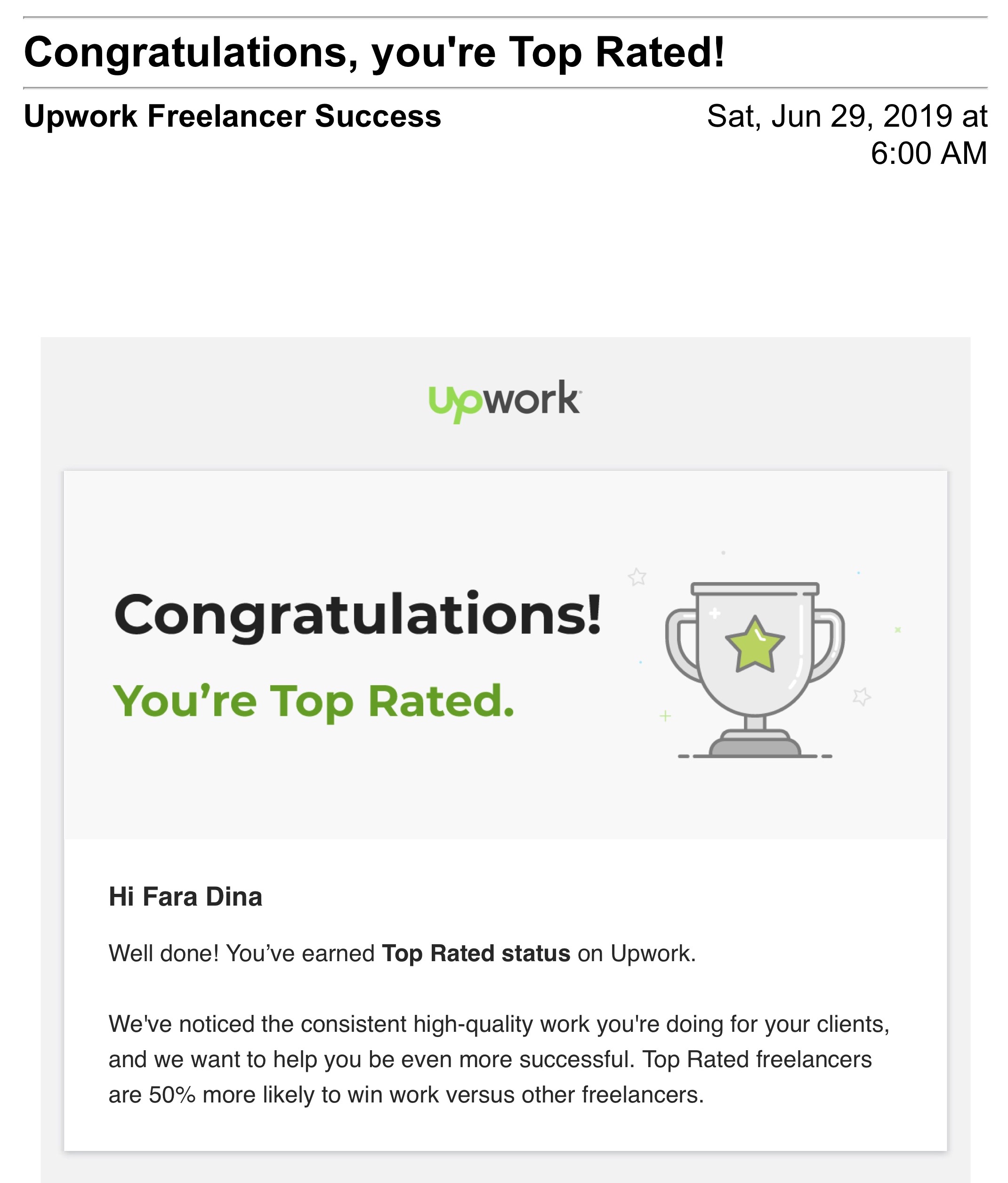 I have been a Top Rated Freelancer on Upwork since 2015, the year when Upwork’s Top Rated program was launched.